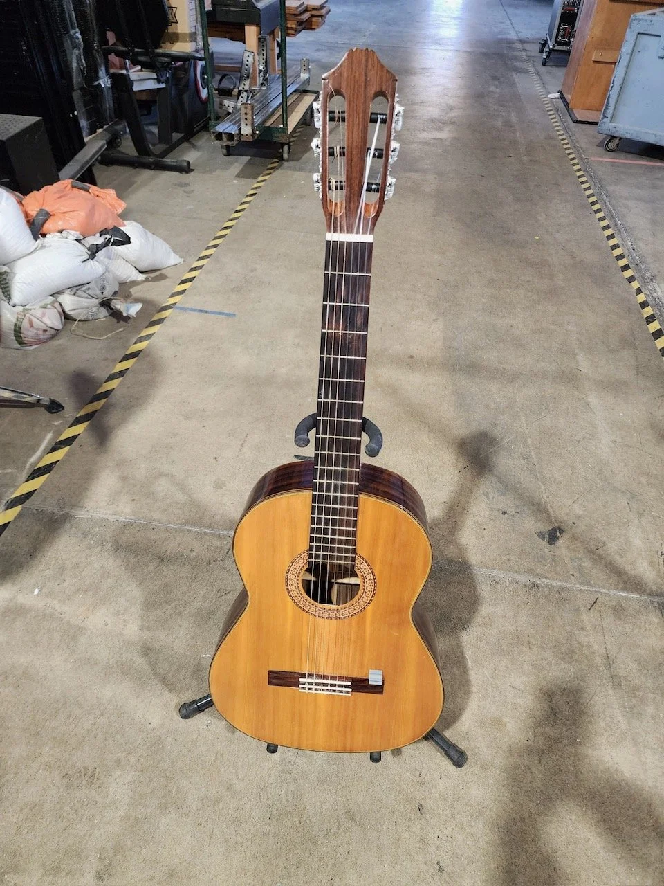 It's a vintage instrument made in Japan in the early 70's it has strong bass and nicely ringing trebles. It's in decent shape for its vintage, tuners are the originals of the era. It has a decorative nice rosette. The neck appears straight and well attached, it has only a few minor surface scratches on the body, excellent built quality, clear bright sound. Really a nice beginner guitar. Nylon strings.